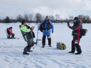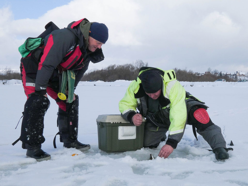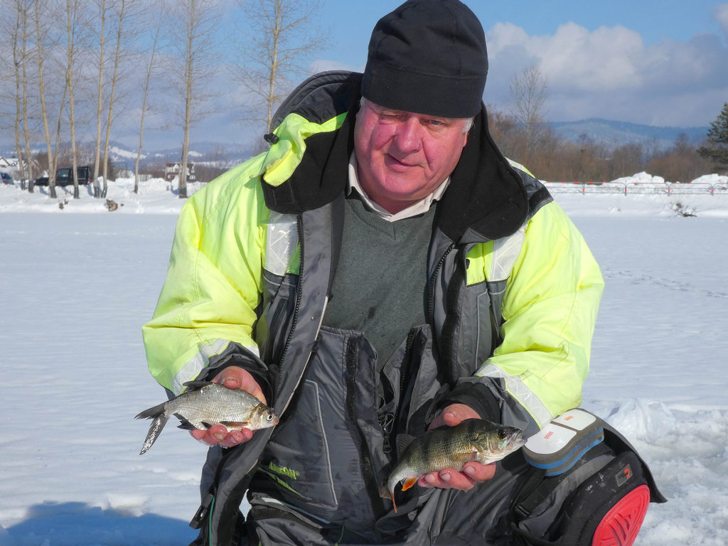 Nasz staw w Ludźmierzu gościł dziś sześciu miłośników podlodowego łowienia i nawet całkiem przyzwoicie obdarzył rybami. Naturalnie dominowała drobna płoć, ale i leszczyki się zdarzały i przyzwoite okonie, a do tego dość sporo szczupaków. Pobawić się można było. Pokrywa lodowa ma około 17 centymetrów, więc mimo zapowiadanego ocieplenia może wytrzyma choć tydzień